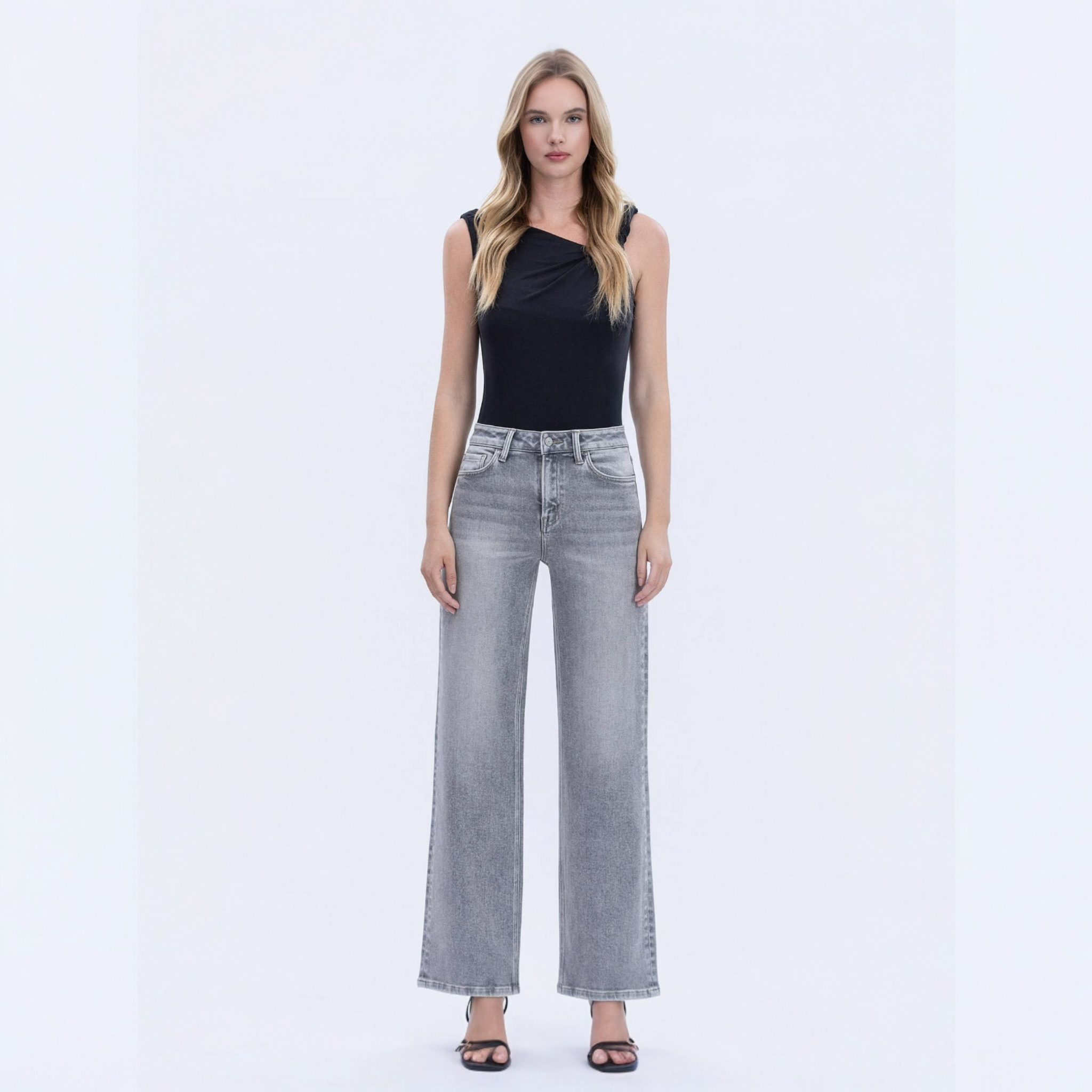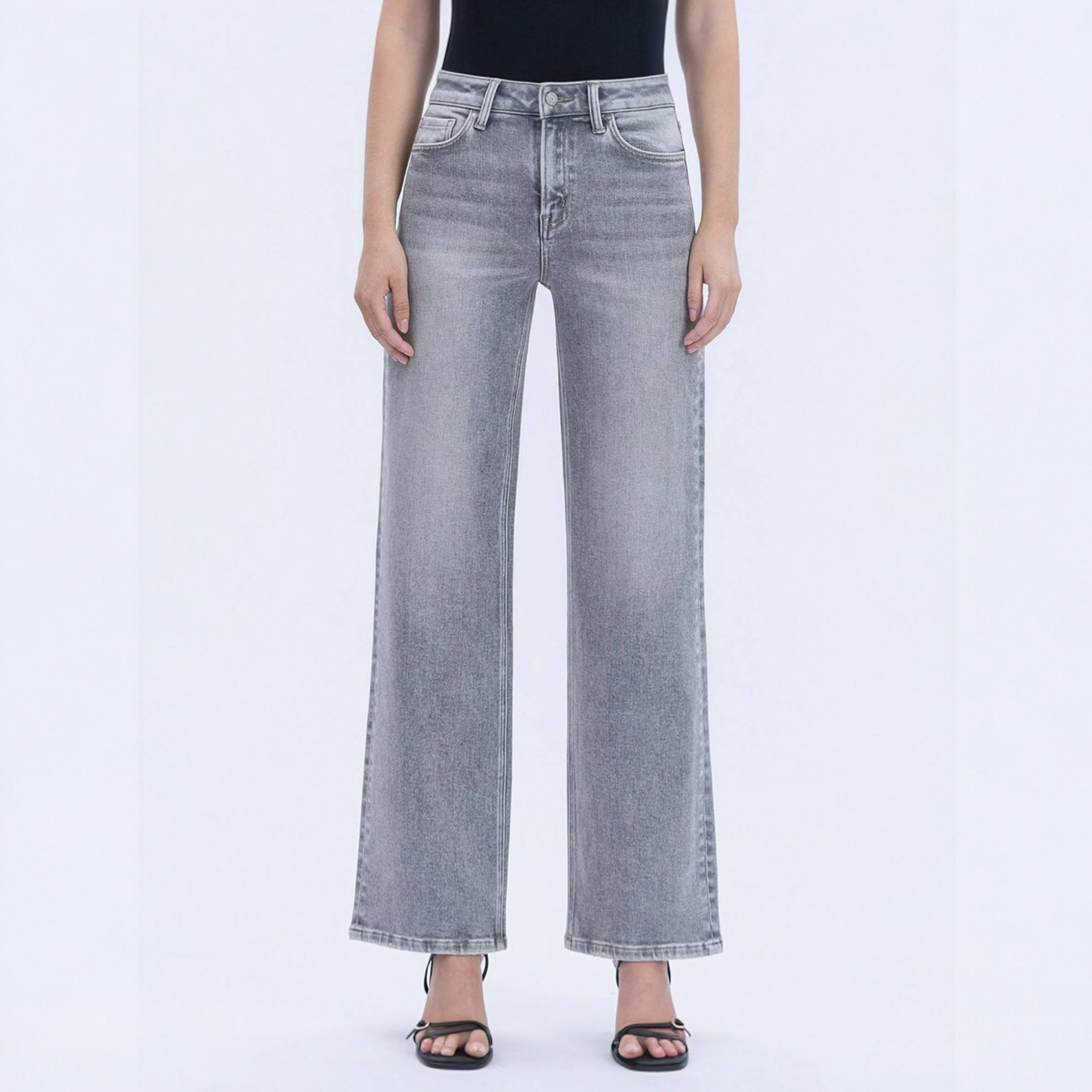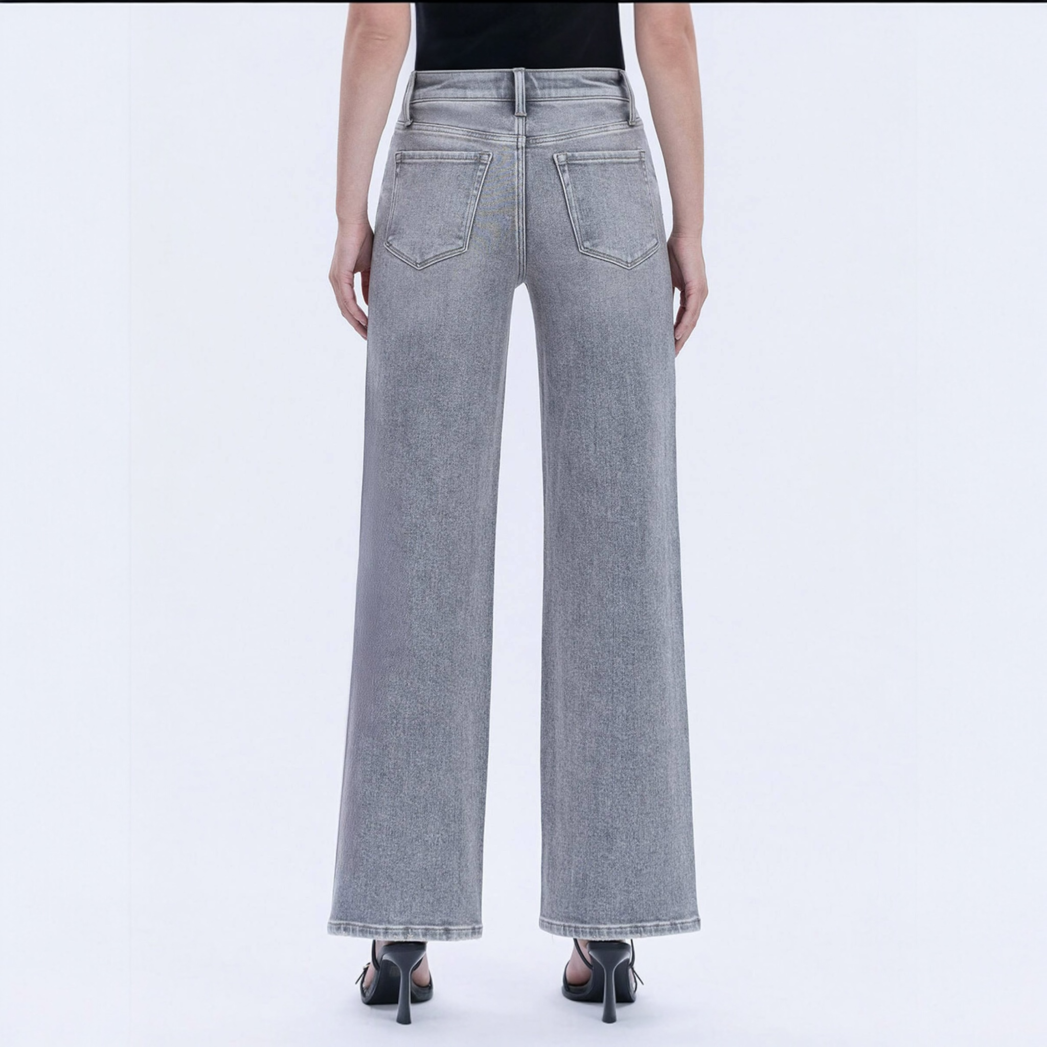 HIGH RISE FULL LENGTH GREY WIDE LEG JEANS COMFORT STRETCH DENIM, HIGH RISE WAIST, FINISHED HEM, FULL LENGTH, GREY WIDE LEG JEANS