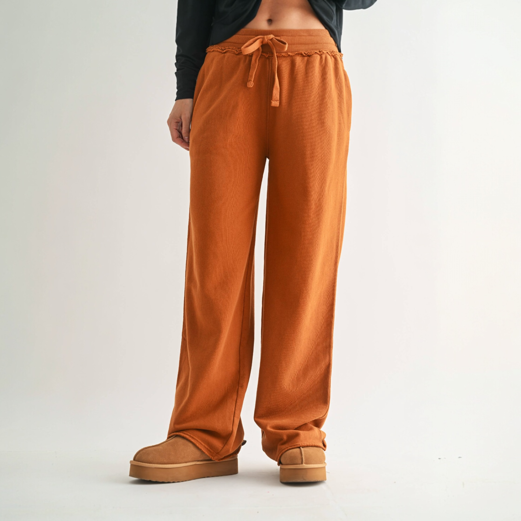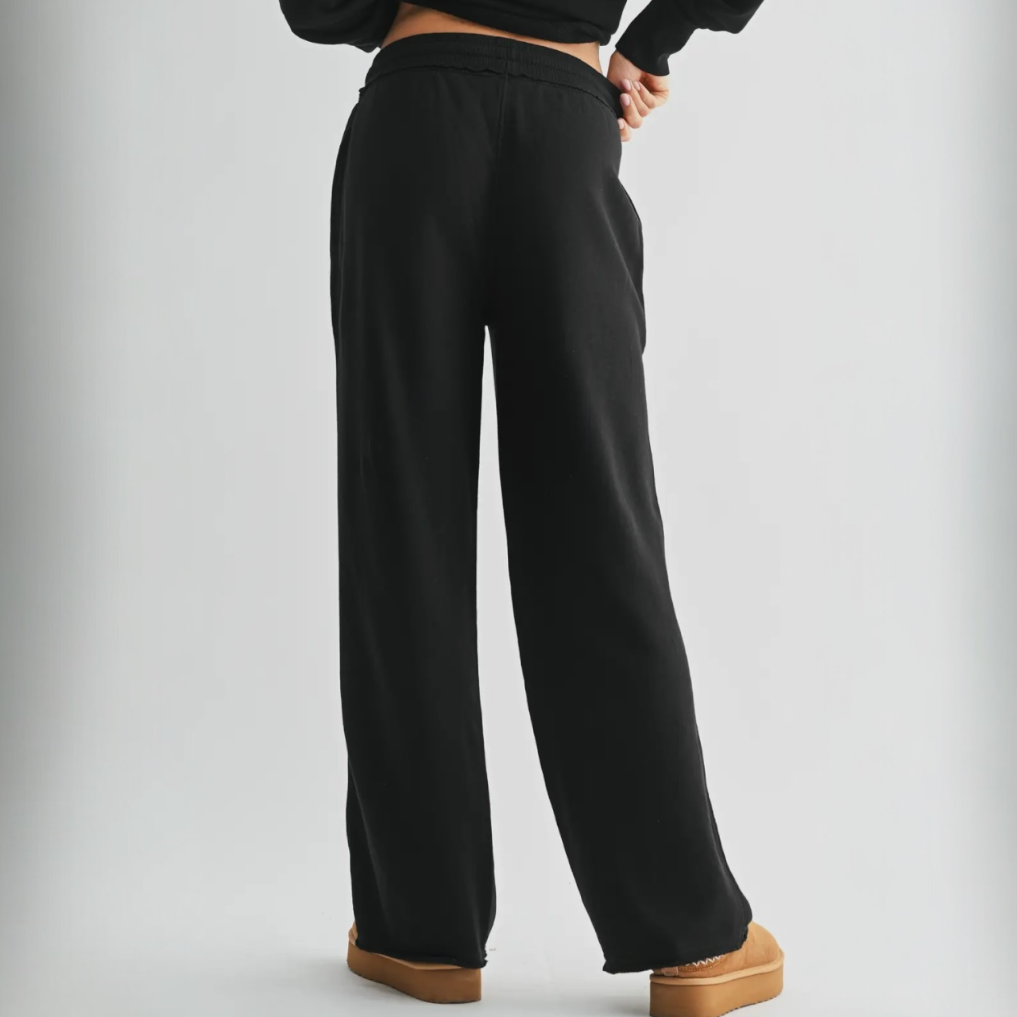 These wide-leg pants, crafted from soft cotton fleece, offer a relaxed and effortlessly stylish vibe with a subtle edge. Featuring a raw edge waistband and hem, they present a lived-in, undone appearance. The drawstring elastic waistband ensures a personalized fit, while side pockets enhance their functional, flowing design. Ideal for lounging, layering, or comfortable casual wear with a refined touch.