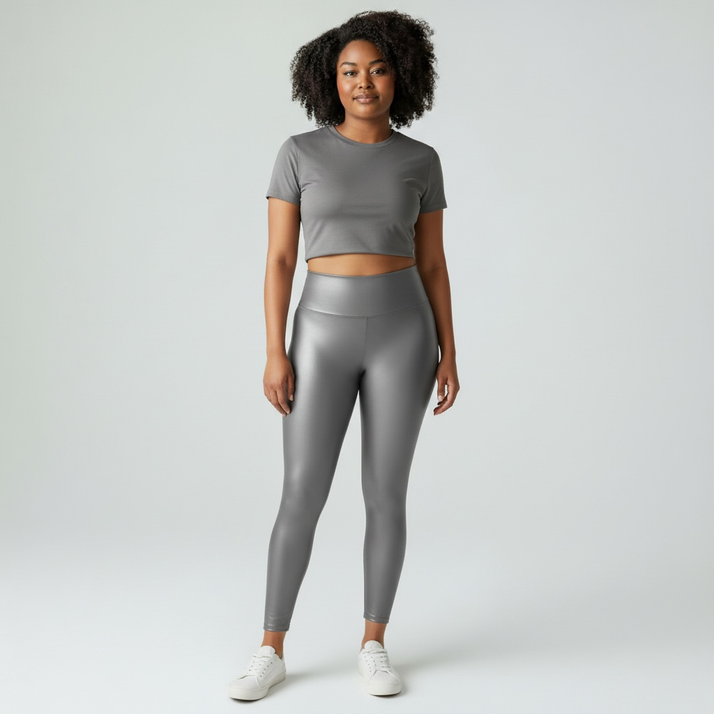 High waist faux leather pu legging with light fleece lined. Elastic waist band with fitted style. Shinny and stretch thicker pu leather.