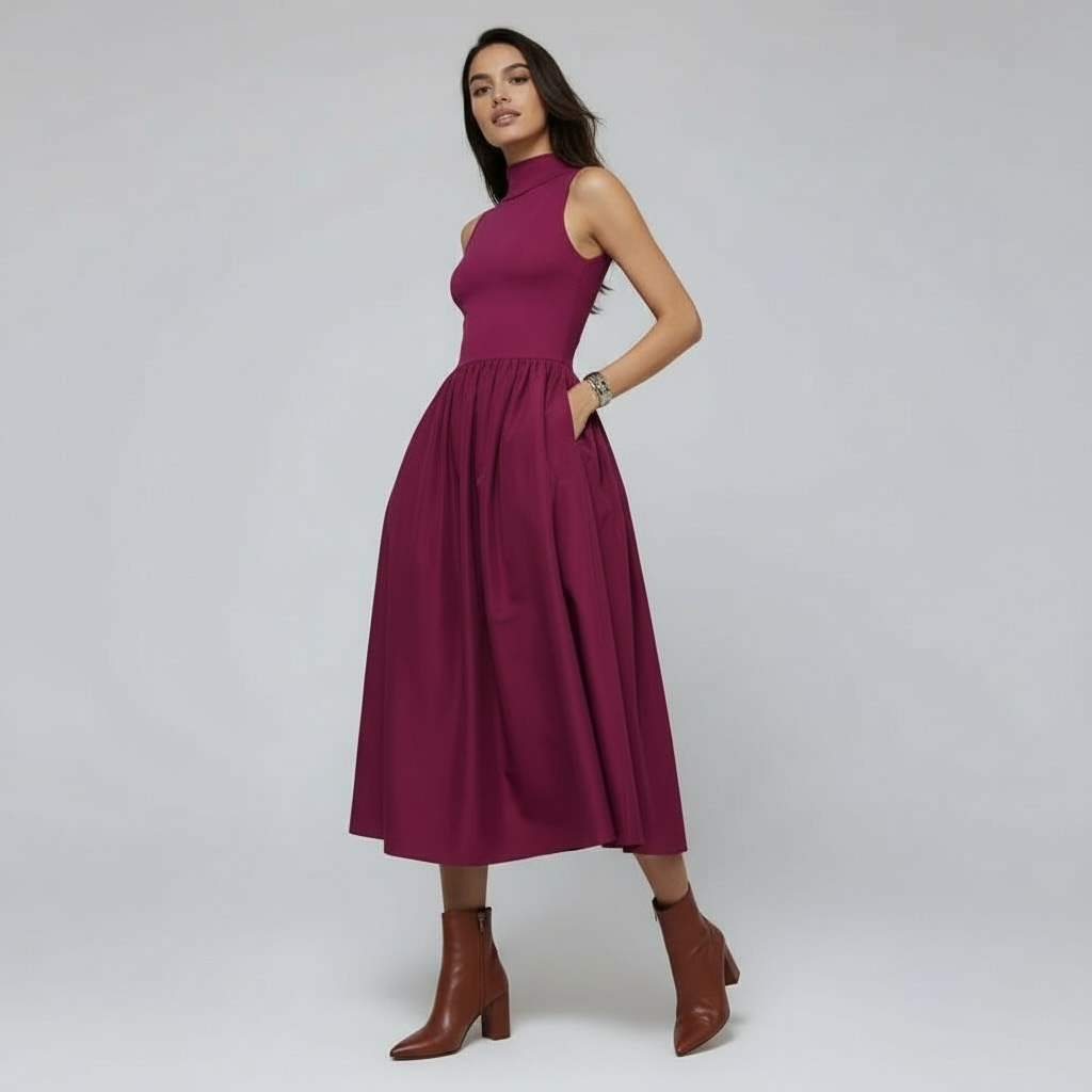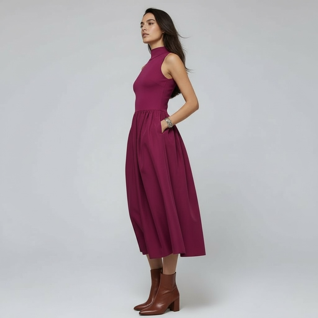 Effortlessly chic, this sleeveless midi dress pairs a buttery-soft jersey knit top with a graceful woven skirt for a look that's polished without trying too hard. The mock neck and sleeveless design keep things modern and fresh, while hidden pockets are the cherry on top. Whether you're heading to a wedding, a romantic dinner, or anywhere that calls for a little extra polish, this dress delivers sophistication with a wink.