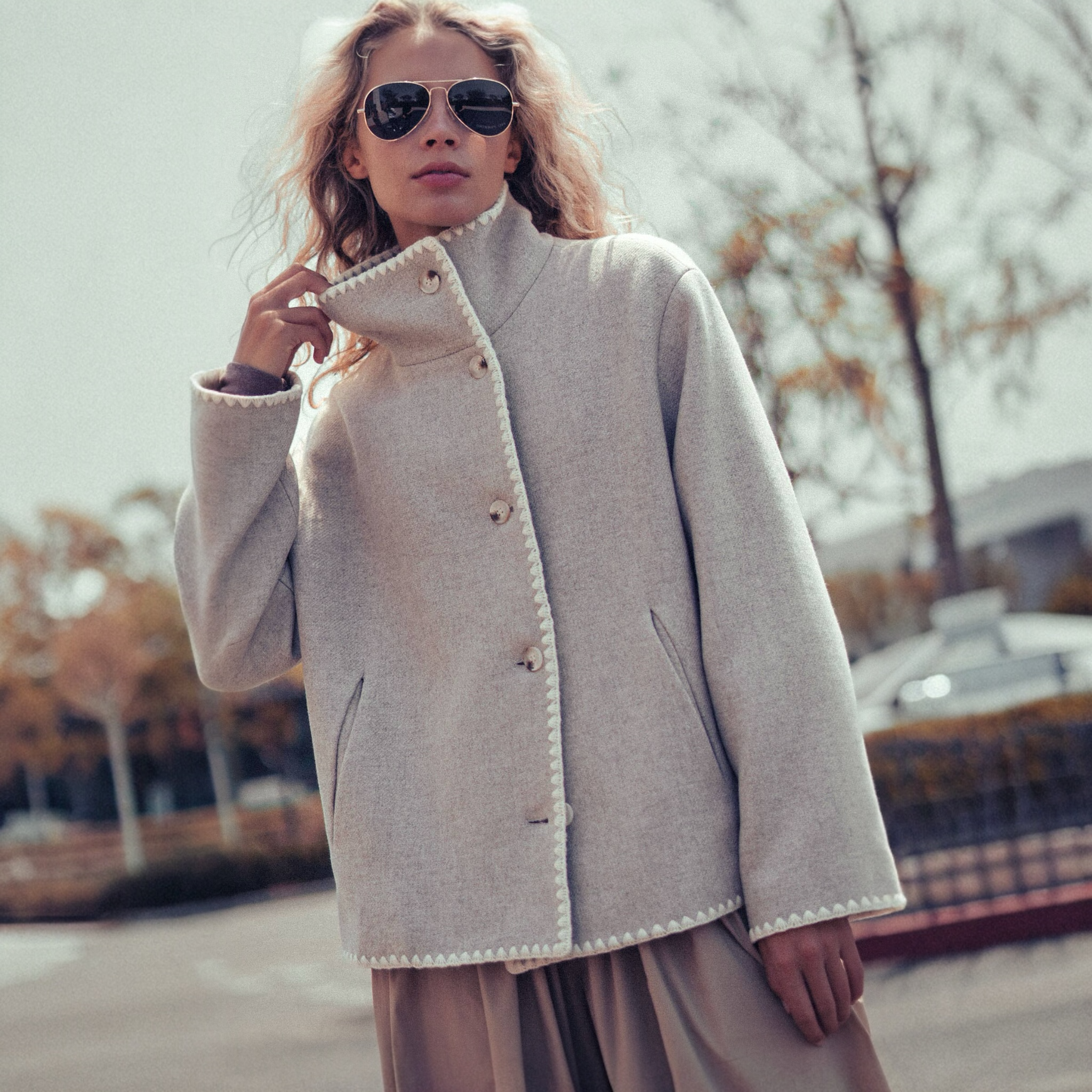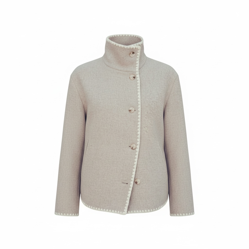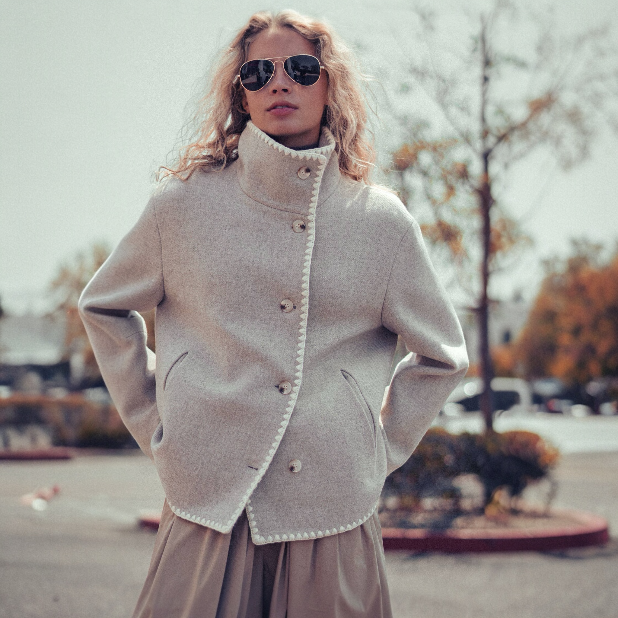 A refined and versatile layering piece, this jacket is crafted from a warm and structured wool-blend. It features a clean stand collar and is accented with contrast embroidered trim for a touch of subtle, artisanal detail. The relaxed, boxy silhouette offers a modern look that is both polished and effortless. A classic button-front jacket with a structured stand collar and delicate, contrasting embroidered trim along the edges.