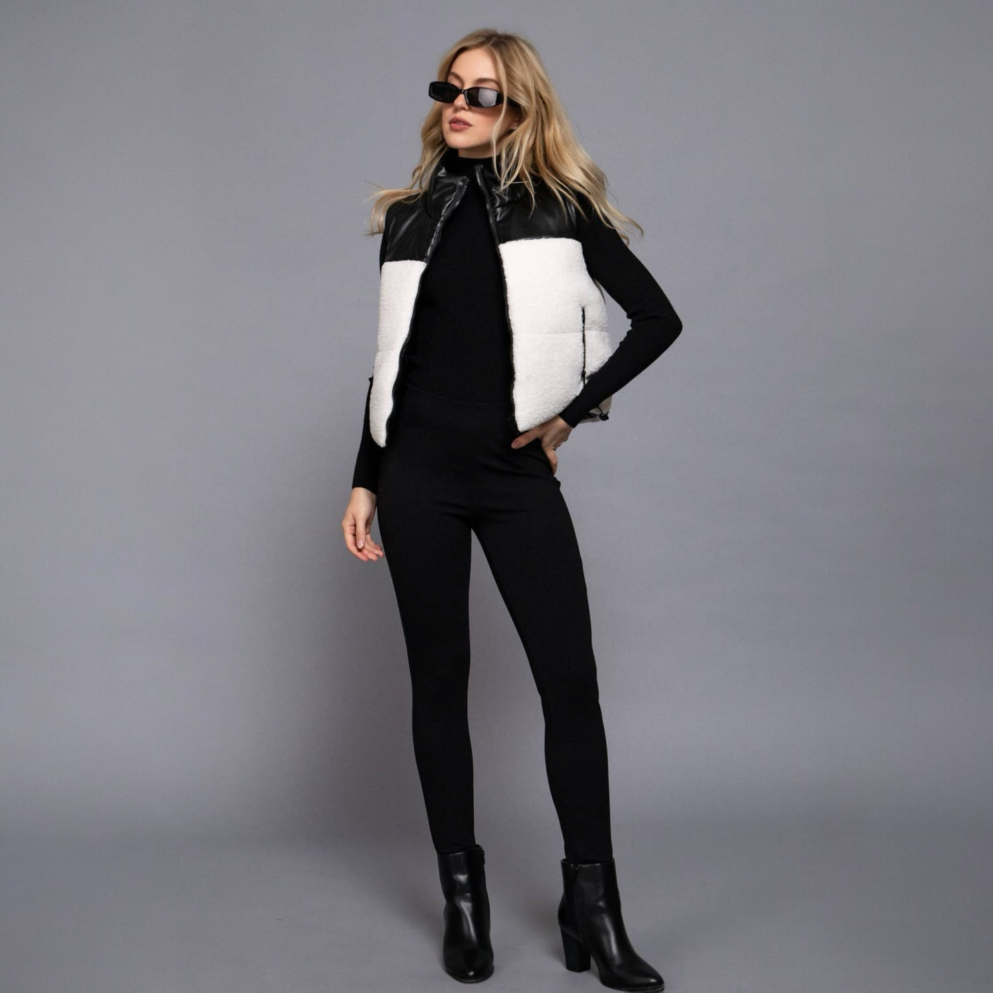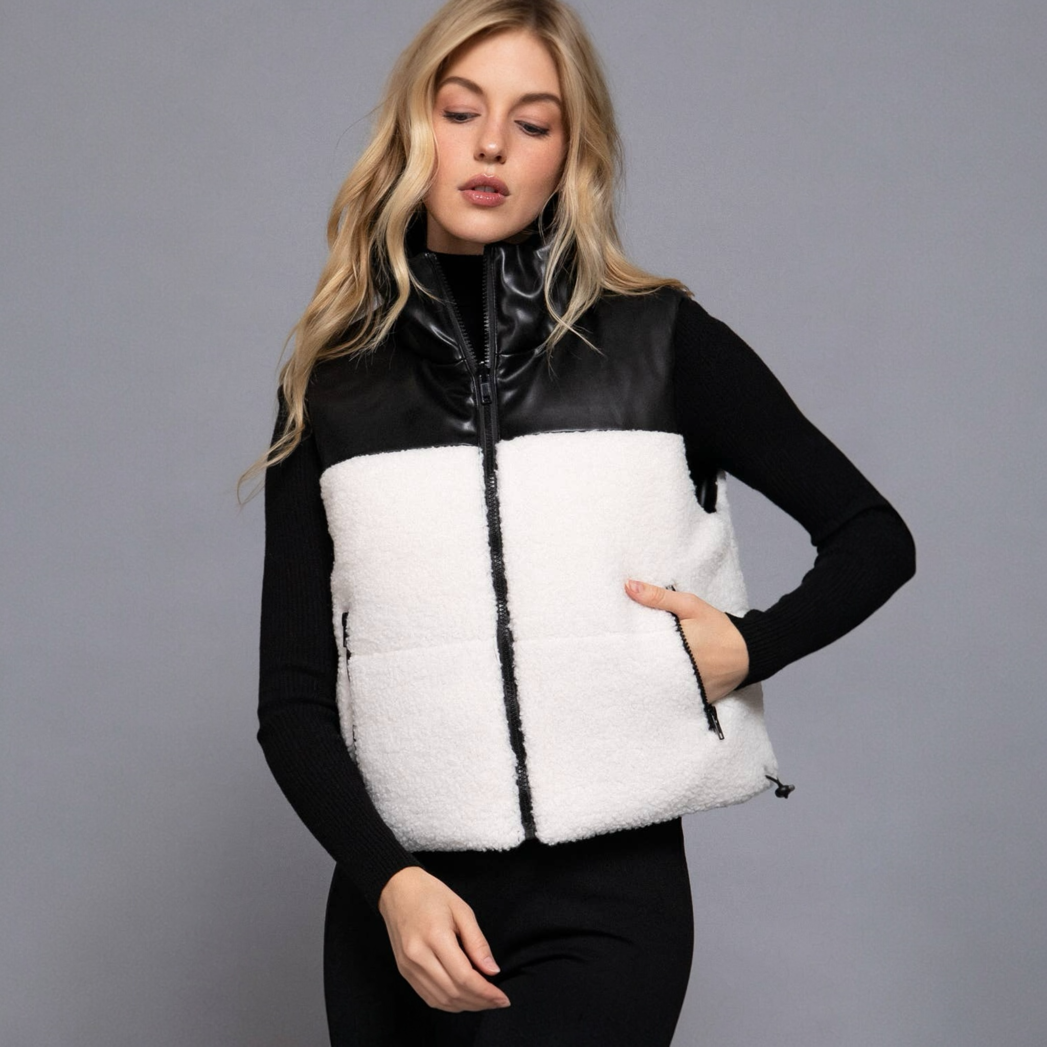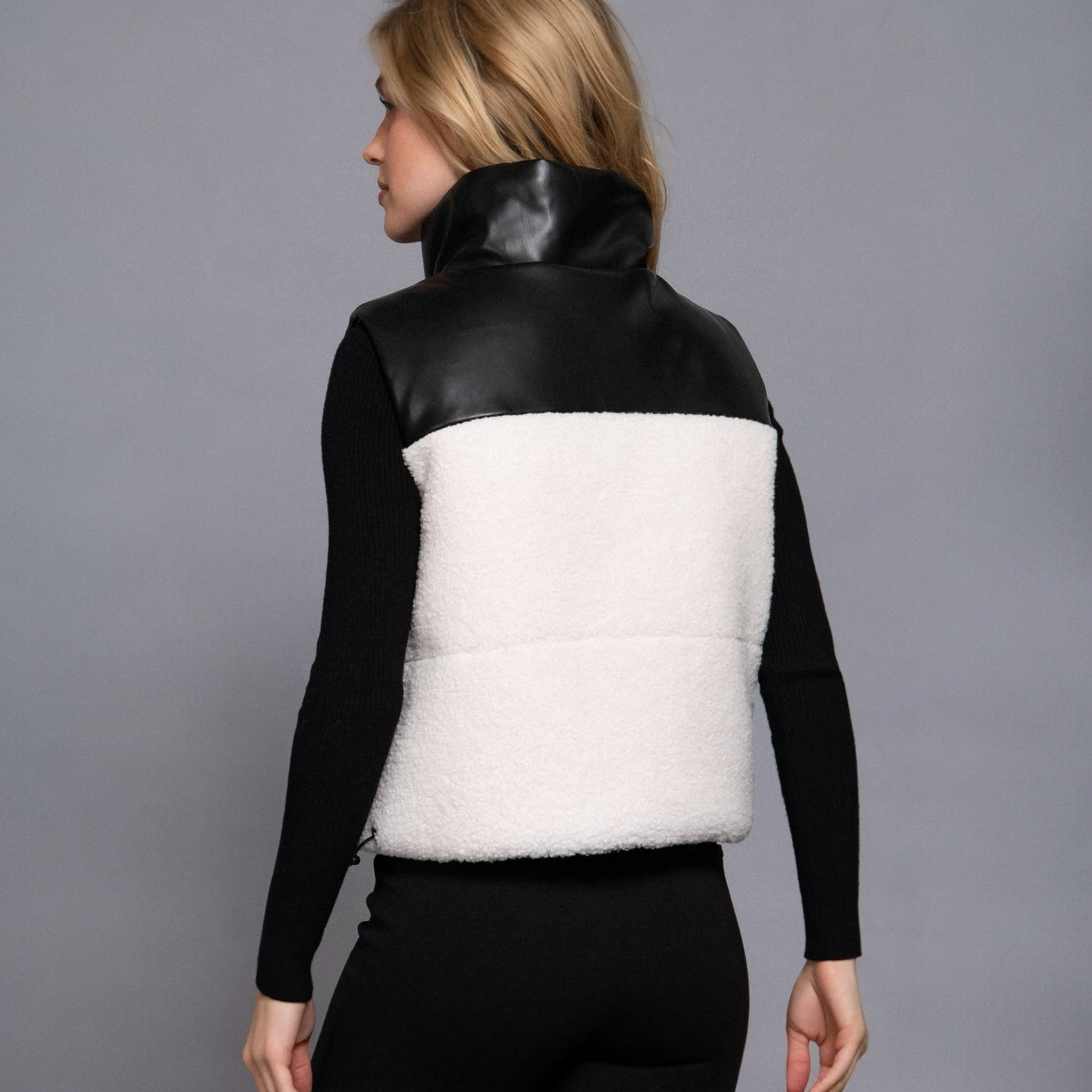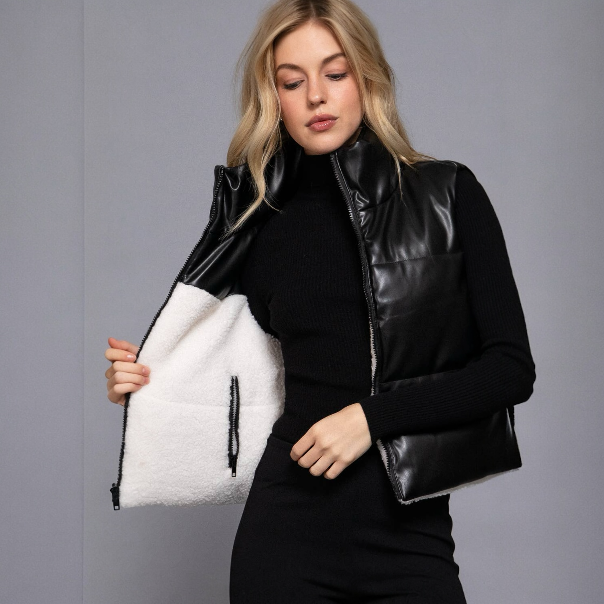 Crafted from premium faux leather with a plush sherpa reverse, this cropped vest seamlessly transitions between two distinct aesthetics. The contrast padding detail adds architectural interest and dimension, while the reversible design ensures versatile styling options for any occasion. A refined piece that elevates your layering game with effortless sophistication.