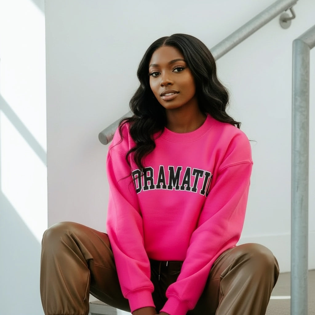 This unisex crewneck combines comfort and style, featuring a bold “dramatic” graphic that makes a statement wherever you go. Perfect for layering or wearing solo, it’s the ultimate blend of cozy and chic. Embrace your expressive side!