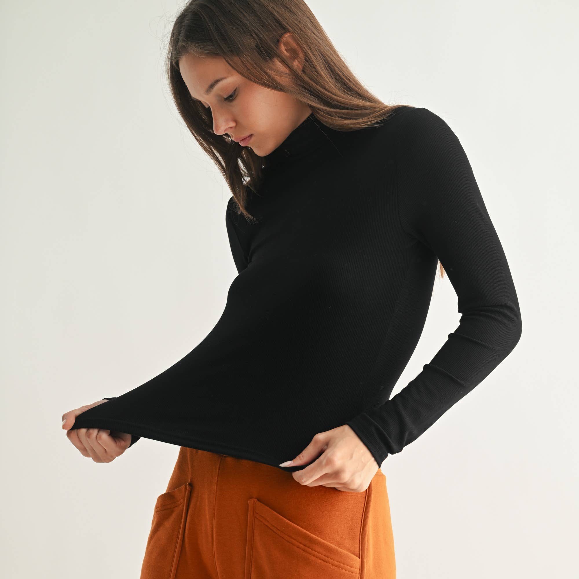 Micro rib long sleeve turtleneck. Hits right above the hip for a flattering fit. Masha is 5'9", a size 4, and is wearing an S