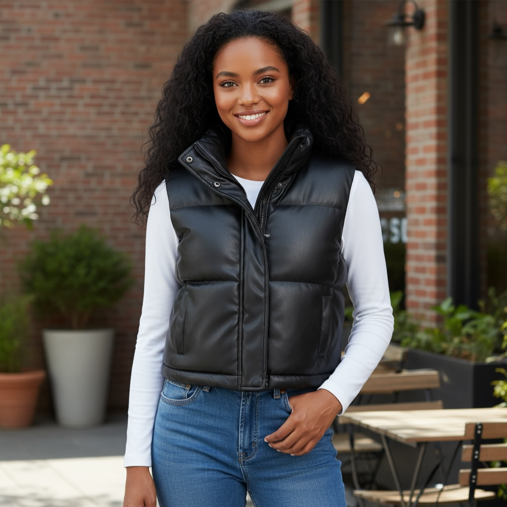 Turn up the edge on cold-weather style with this sleek vegan leather puffer vest. Designed with a cropped silhouette and padded for lightweight warmth, it features a high stand collar, hidden zip front with snap closure, and a clean, modern finish. The soft faux leather gives it a luxe look without compromising comfort or ethics.